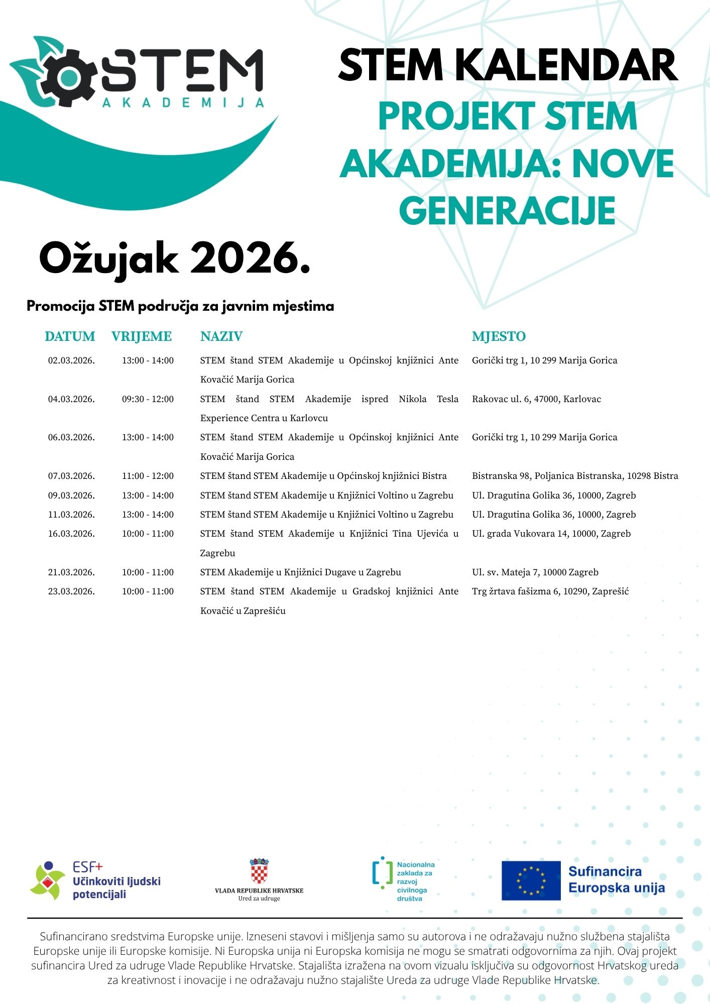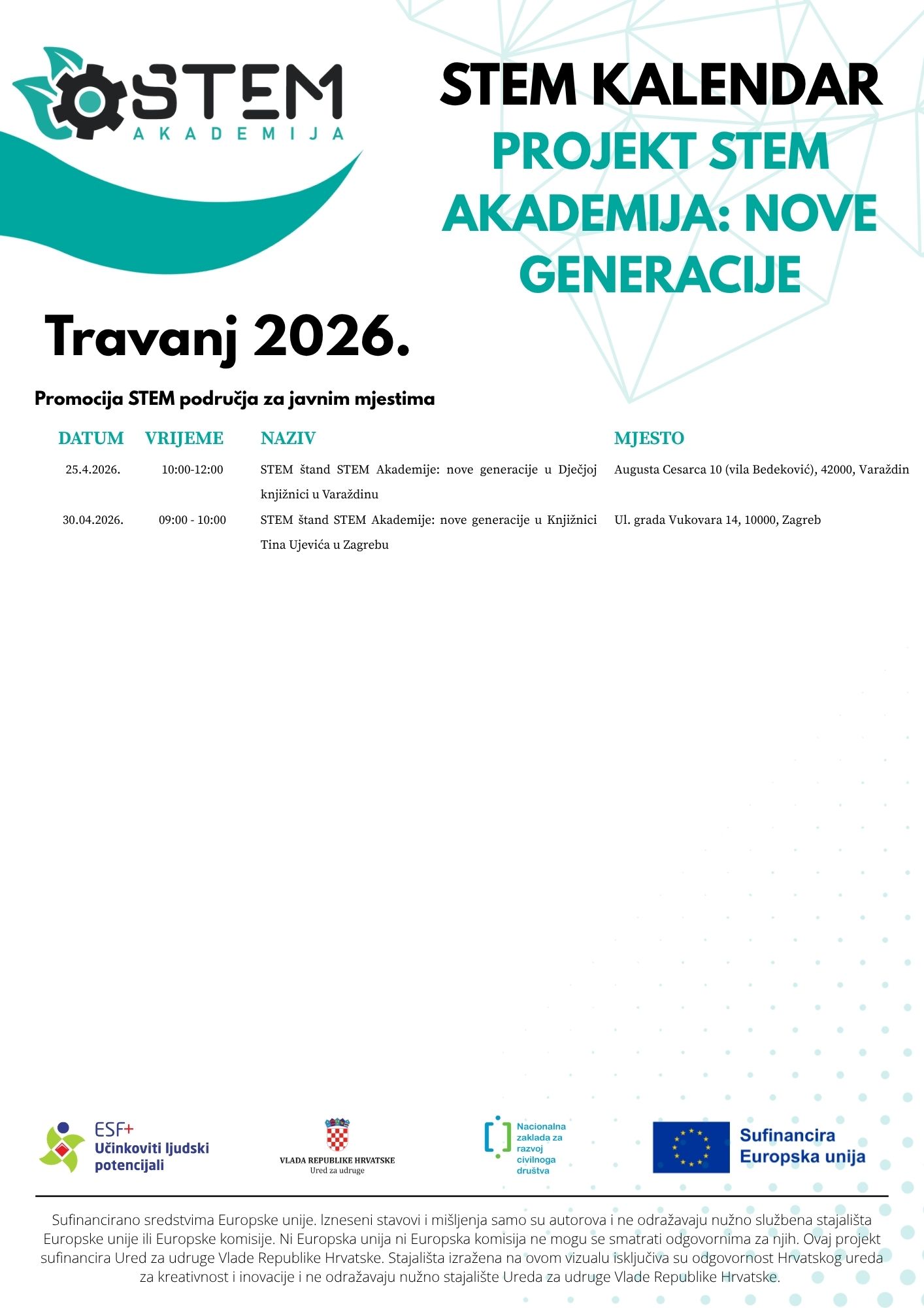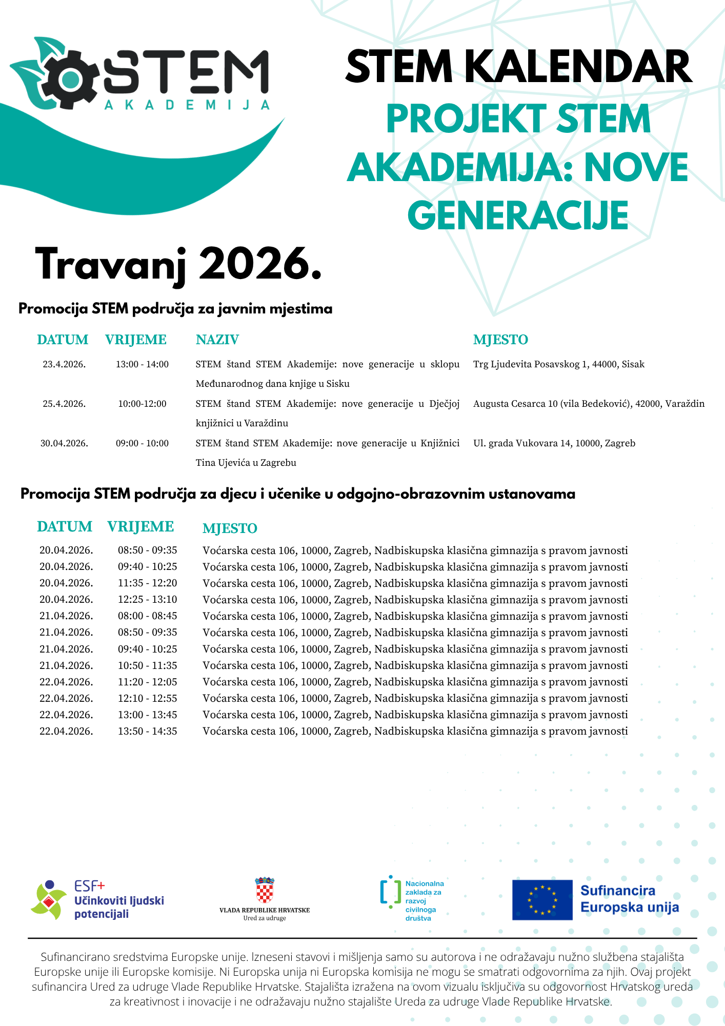 Projekt okuplja preko 1.000 zainteresiranih djece i mladih koji kroz raznovrsne interaktivne, zabavne i kreativne aktivnosti, radionice, festivale te multimedijske sadržaje uče o STEM znanstvenom području i važnosti STEM kompetencija za vlastitu budućnost. Financira ga Europski socijalni fond (ESF+), a sam projekt ukupnog je trajanja dvije godine.